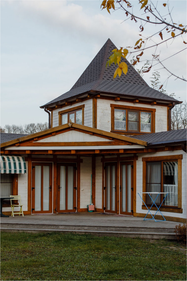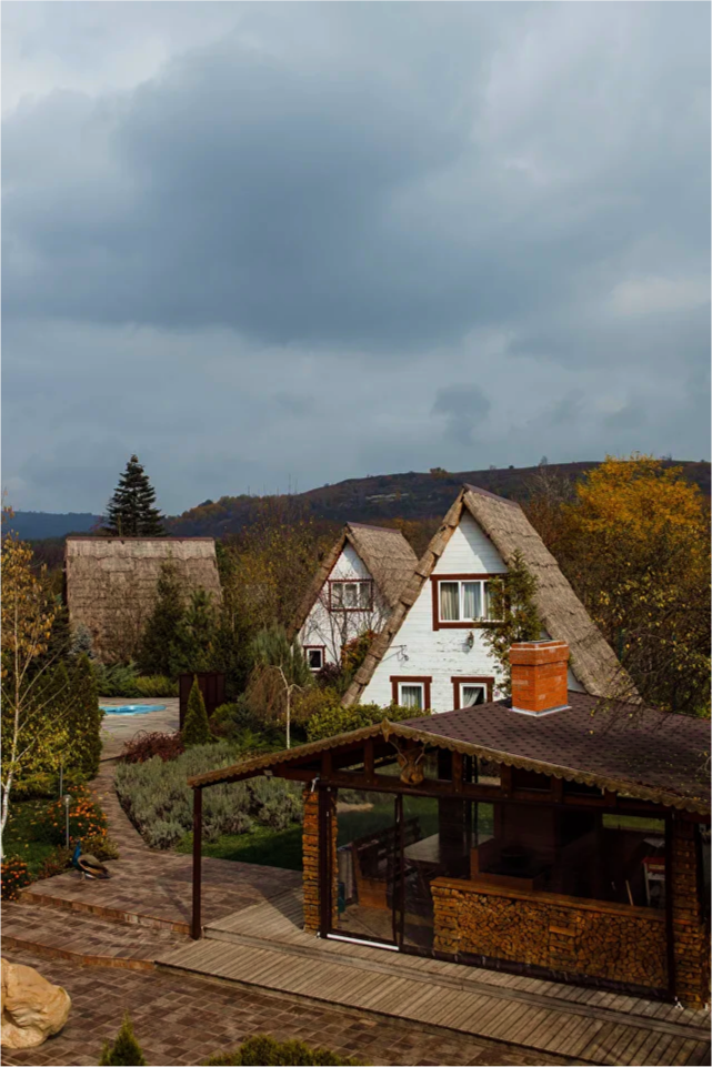 Усадьба примечательна своим индивидуальным эко стилем, выраженным в каждой детали. На территории располагаются 5 домов разной